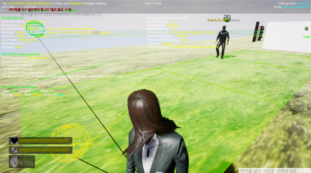 AI는 시각, 청각을 이용하도록 만들었고 쫒아오는 도중 잃어버리거나 안보이는 곳에서 소리가 들렸을때 등 시각, 청각을 모두 이용하여 플레이어들을 찾고 쫒아오고 지정한 구역은 Patrol 하거나 랜덤한 지역을 Patrol 하게 만들었다.