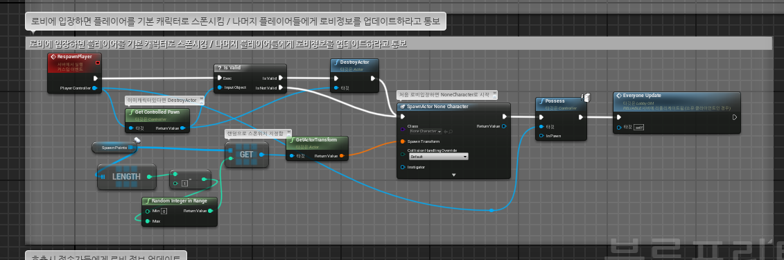 간단히 요약하자면 메인메뉴에서 ServerTravel로 만들어진 방을 찾아오게 만든다음 각자 고유의 PlayerController을 붙여주고 Possess + Spawn Actor 을 해준다