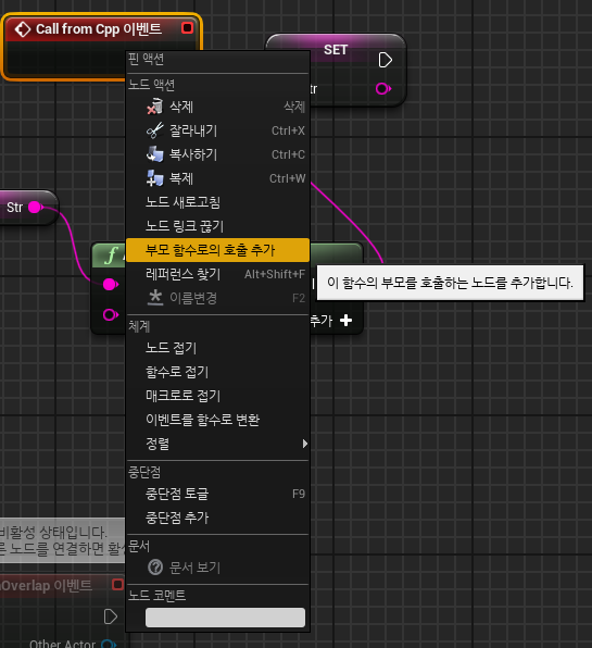 또한 부모함수로의 호출 추가를 만들어서 코더가 cpp에서 정의한 코드랑 디자이너가 블루프린트에서 만든코드 동시 사용가능!! (노드 순서로 호출순서 조정)