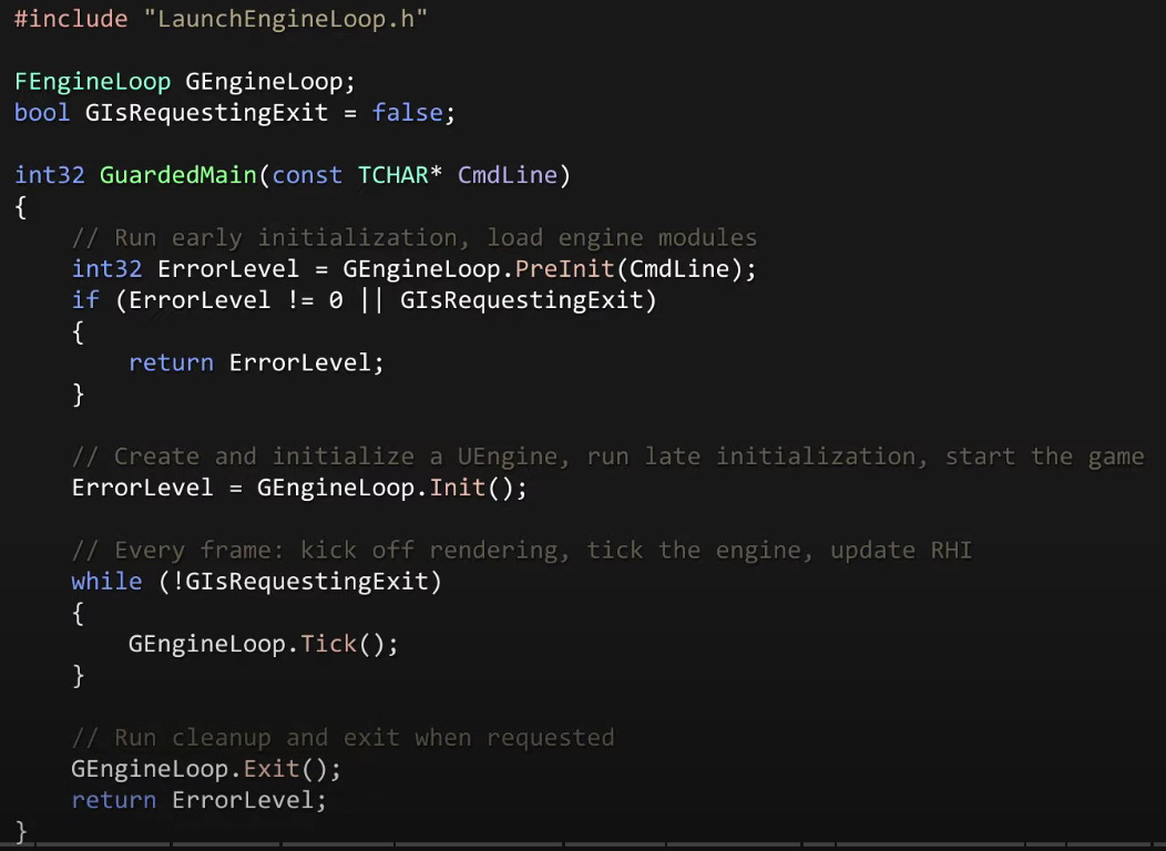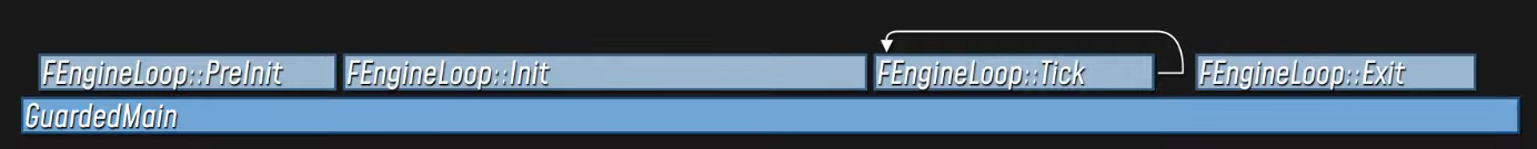 Main함수에서 PreInit(초기화) 하고 EngineLoop준비를 하고 Tick마다 Loop이 되고 Exit이 완료되는 엔진의 게임실행 구조