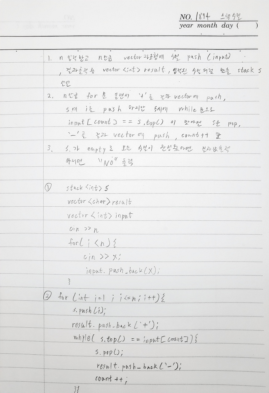 1부터 n까지에 수에 대해 차례로 [push, push, push, push, pop, pop, push, push, pop, push, push, pop, pop, pop, pop, pop] 연산을 수행하면 수열 [4, 3, 6, 8, 7, 5, 2, 1]을 얻을 수 있다.