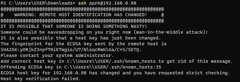ssh 접속시 컴퓨터 내부에 그 접속에 대한걸 저장해 두는데 이 상황처럼 운영체제가 바뀌었다면 생기는 워닝